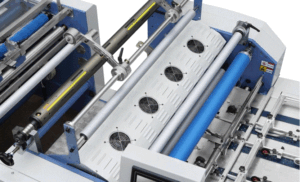 Con lăn cán màng mạ crôm, gia nhiệt bằng điện từ, đường kính lớn Bơm thủy lực đảm bảo áp lực cán màng lớn, đều và ổn định Màng được gắn trên trục khí nén bơm hơi thay đổi nhanh chóng, có vạch chia độ Trục khí nén đảm bảo độ căng và tốc độ nhả màng chính xác Cơ chế cắt và bấm răng cưa trên màng |