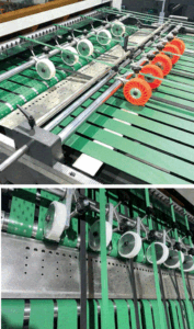– Sử dụng băng tải PU tốc độ cao thấp, tuổi thọ sử dụng cao. Độ căng băng tải có thể điều chỉnh đảm bảo vận chuyển giấy trơn tru. -Bộ khử tĩnh điện được lắp đặt trên bộ nạp giấy để loại bỏ tĩnh điện hiệu quả khỏi giấy, đảm bảo vận chuyển giấy trơn tru hơn và tăng tốc độ cắt. – Sử dụng băng tải giảm công suất khi chạy tốc độ thấp, sử dụng con lăn mặt trời để tạo ra sự chênh lệch tốc độ cao và thấp giữa giấy và ngăn ngừa va đập mạnh trong quá trình xếp chồng. Điều này giúp giảm thiểu hiệu quả hiện tượng lồi lõm, đốm trên bề mặt giấy. – Thiết bị dừng khi bị kẹt giấy giúp giảm thiểu lãng phí do lỗi vận hành. |