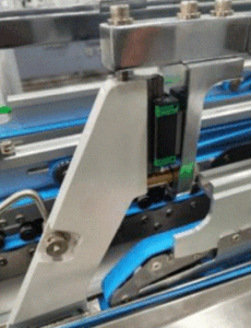 Băng tải ngang: -Máy thu hộp thông qua bộ phận xoay dọc và gửi các hộp thẳng đứng đến bộ phận băng truyền ngang. Chỉ những hộp thẳng đứng được sắp xếp gọn gàng mới có lợi cho công nhân lấy các hộp trên băng truyền ngang để đóng gói. -Băng truyền ngang của máy thu hộp sử dụng cấu trúc tấm dẫn hướng và hai bộ băng tải rộng rộng 50 vận chuyển các hộp. Cấu trúc tấm dẫn hướng này thuận lợi cho việc đặt băng keo đóng gói và thùng carton đóng gói bên dưới hộp. – Tấm dẫn hướng của băng truyền ngang của máy thu hộp được đỡ bằng một thanh trượt, thanh vít dẫn động sang trái và phải. Thanh vít có thể được lắc để điều chỉnh theo kích thước của hộp. -Băng truyền ngang của máy thu hộp có thể được điều chỉnh lên xuống tổng thể để thích ứng với các hộp có kích thước khác nhau để hộp luôn được vận chuyển ở giữa, có thể vận chuyển hộp lên xuống ổn định hơn, điều chỉnh thông qua cấu trúc dẫn hướng tuyến tính vít. – Băng tải ngang được điều khiển bởi một động cơ độc lập, điều chỉnh tốc độ bằng biến tần, có thể được điều chỉnh tự động theo tốc độ của máy chủ hoặc bằng thủ công. -Băng tải ngang ngang được trang bị thiết bị chặn giấy để ngăn thùng carton thẳng đứng bị lật. Thiết bị này sử dụng thanh trượt và lực côn để chặn hộp tốt mà không ảnh hưởng đến khả năng lấy hộp của công nhân. |